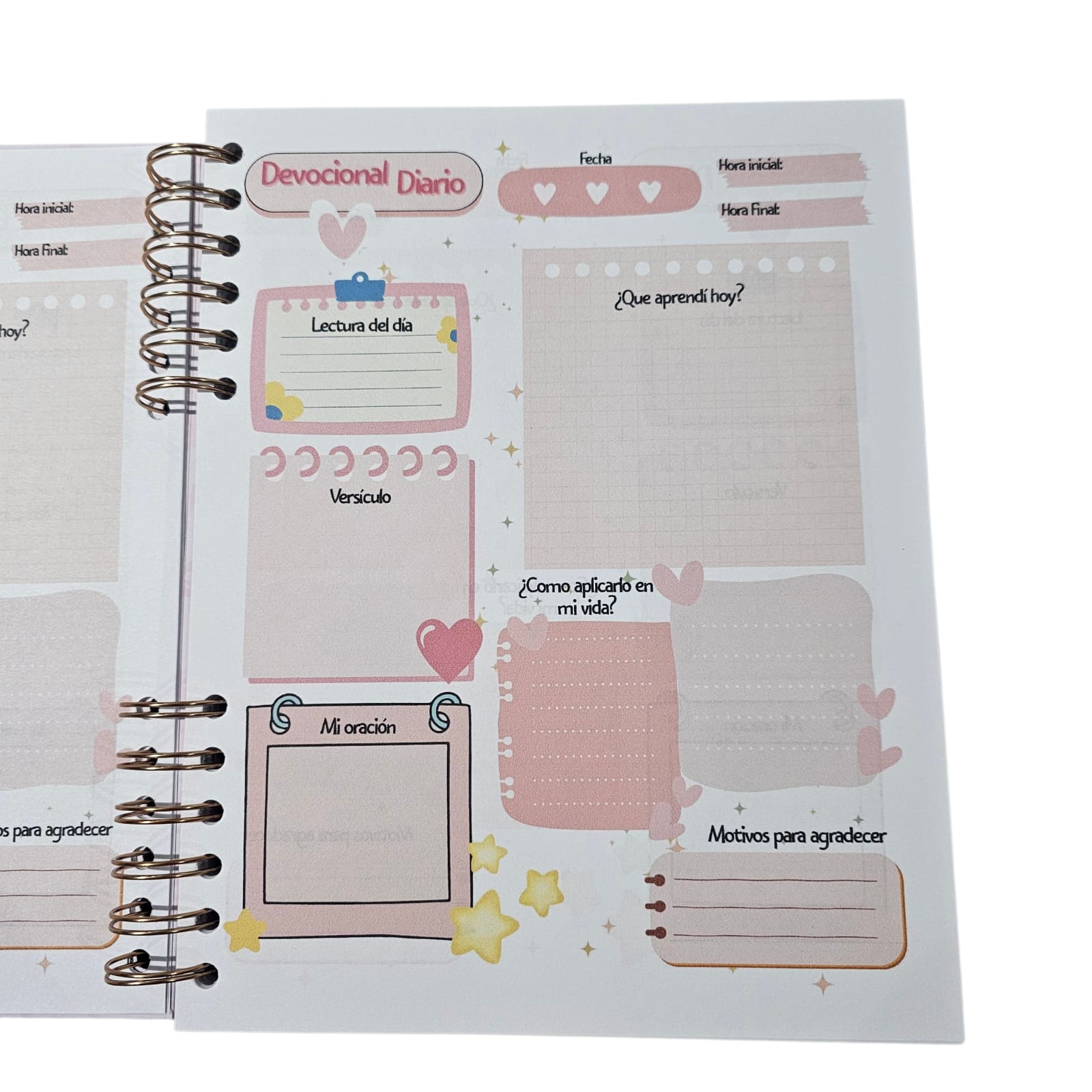 Es un cuaderno devocional creado especialmente para ti. Su propósito es acompañarte cada día en tu encuentro personal con Dios, ayudarte a profundizar en Su Palabra, a meditar en ella y a guardarla en tu mente y en tu corazón, para que puedas vivirla en tu día a día